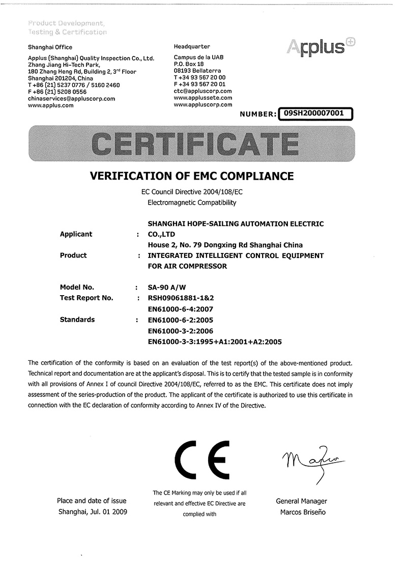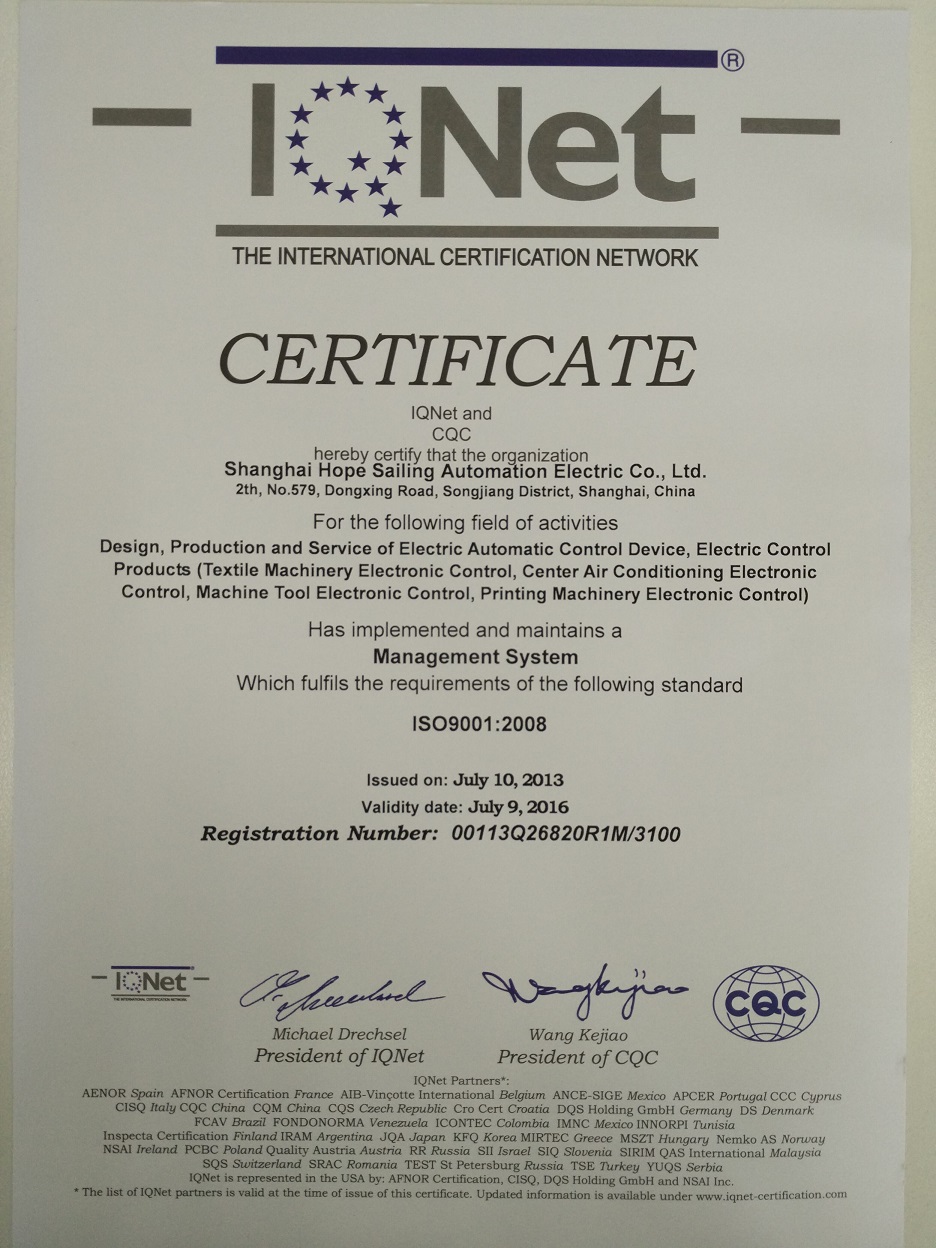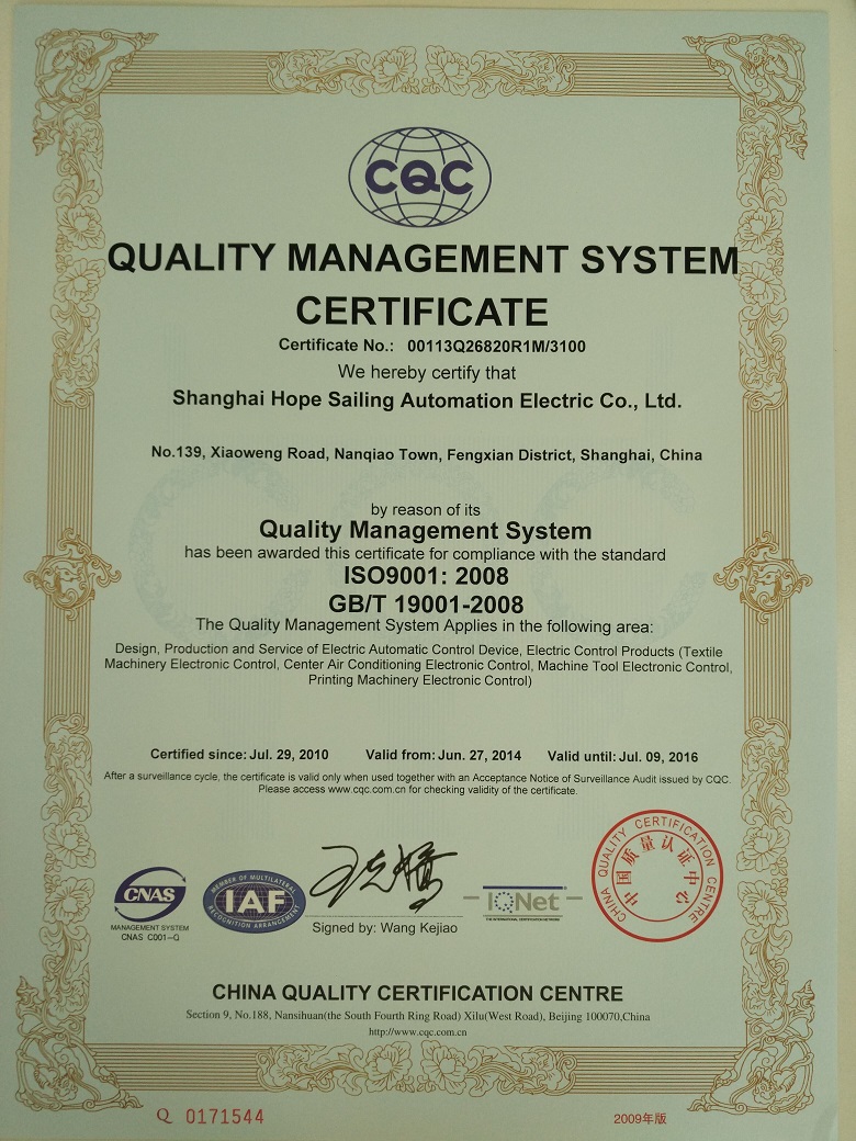 The company in 2009 passed ISO9001: 2000 quality management system certification, certificate number: 00107Q12352R0M / 3100.